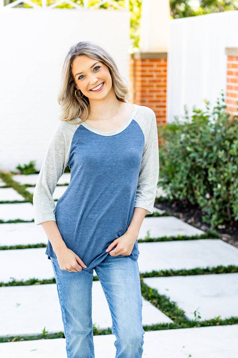 Look cute and stylish in our Blank Faded Blue & Grey Striped Raglan! Perfect for any occasion, this raglan adds a pop of fun to any outfit. Stay cozy and trendy with our unique design. (No boring stripes here!)