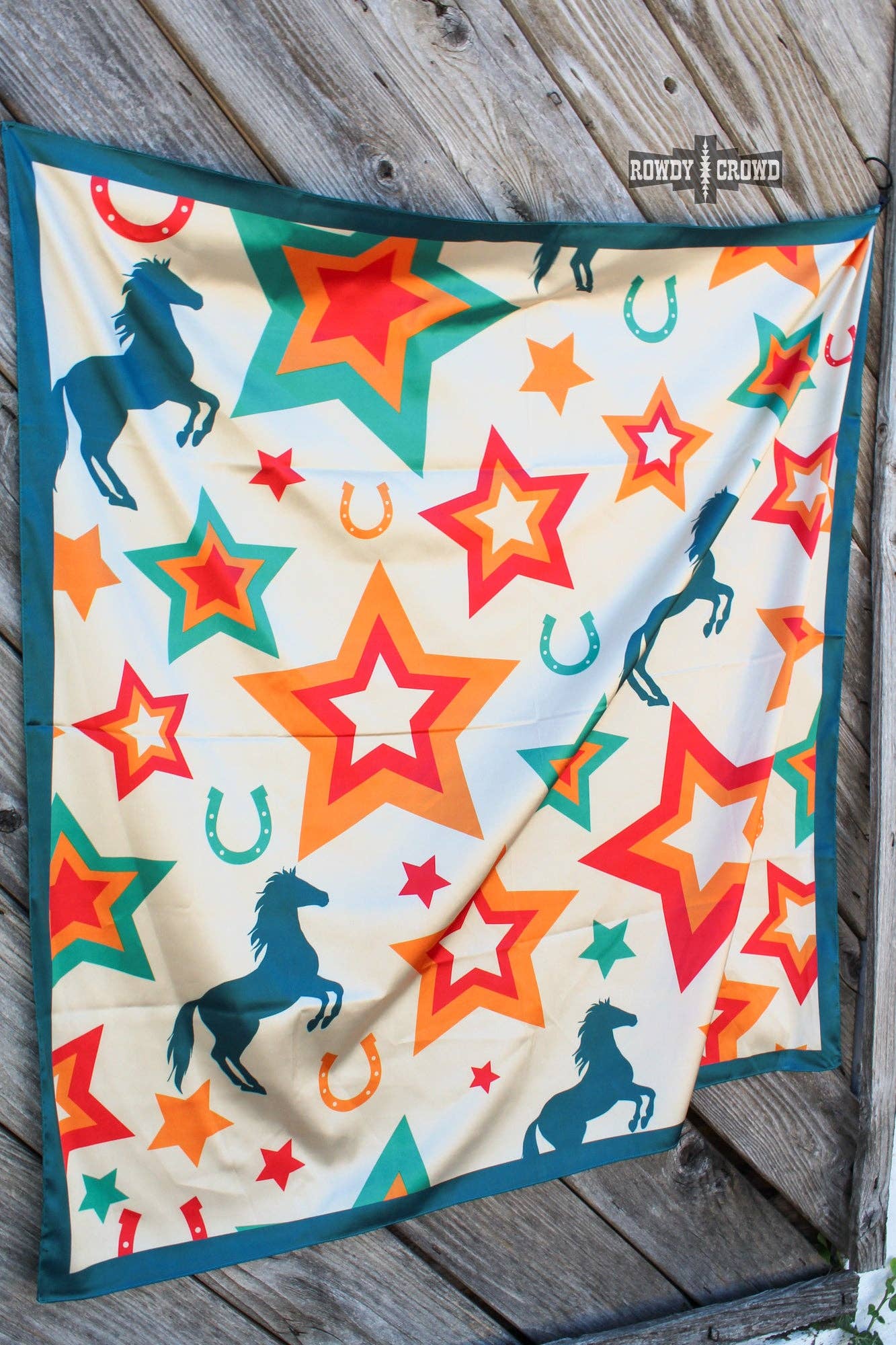 Unleash your inner wild with the Buck Off Wild Rag! Featuring playful horses and stars in bright, shiny colors, this versatile accessory can be worn as a top, in your hair, or on your bag. Express your rowdy side with style and flair!