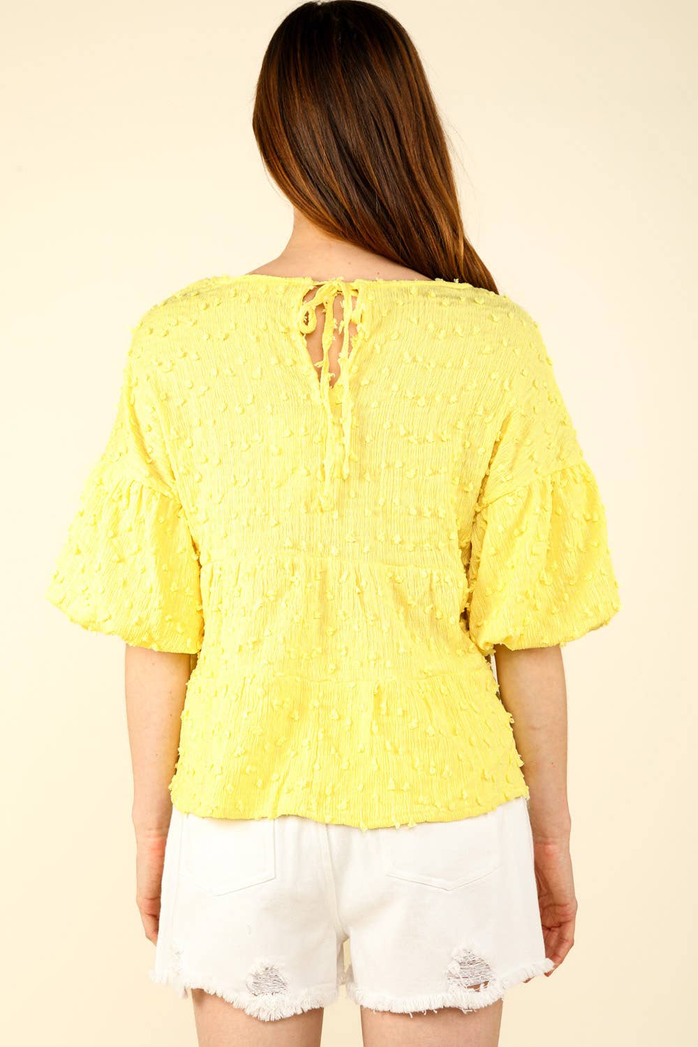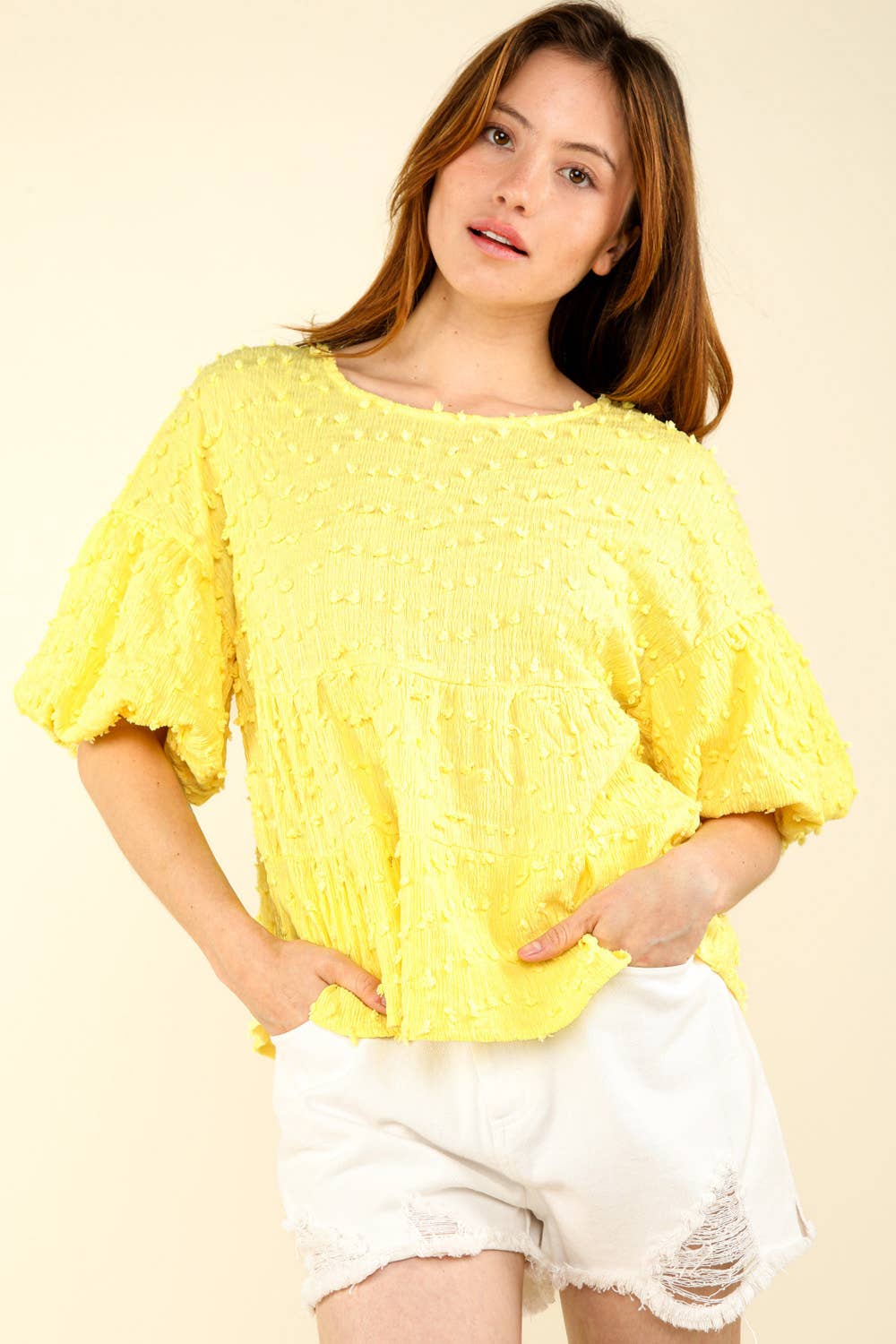 Introducing our Crinkle Pom Pom Knit Puff Sleeve Babydoll Top in the bright and lively color of lemon! This cute top with playful pom poms and puff sleeves is the perfect addition to any fun-loving wardrobe. Stay stylish and add a pop of color with our lemon top today!