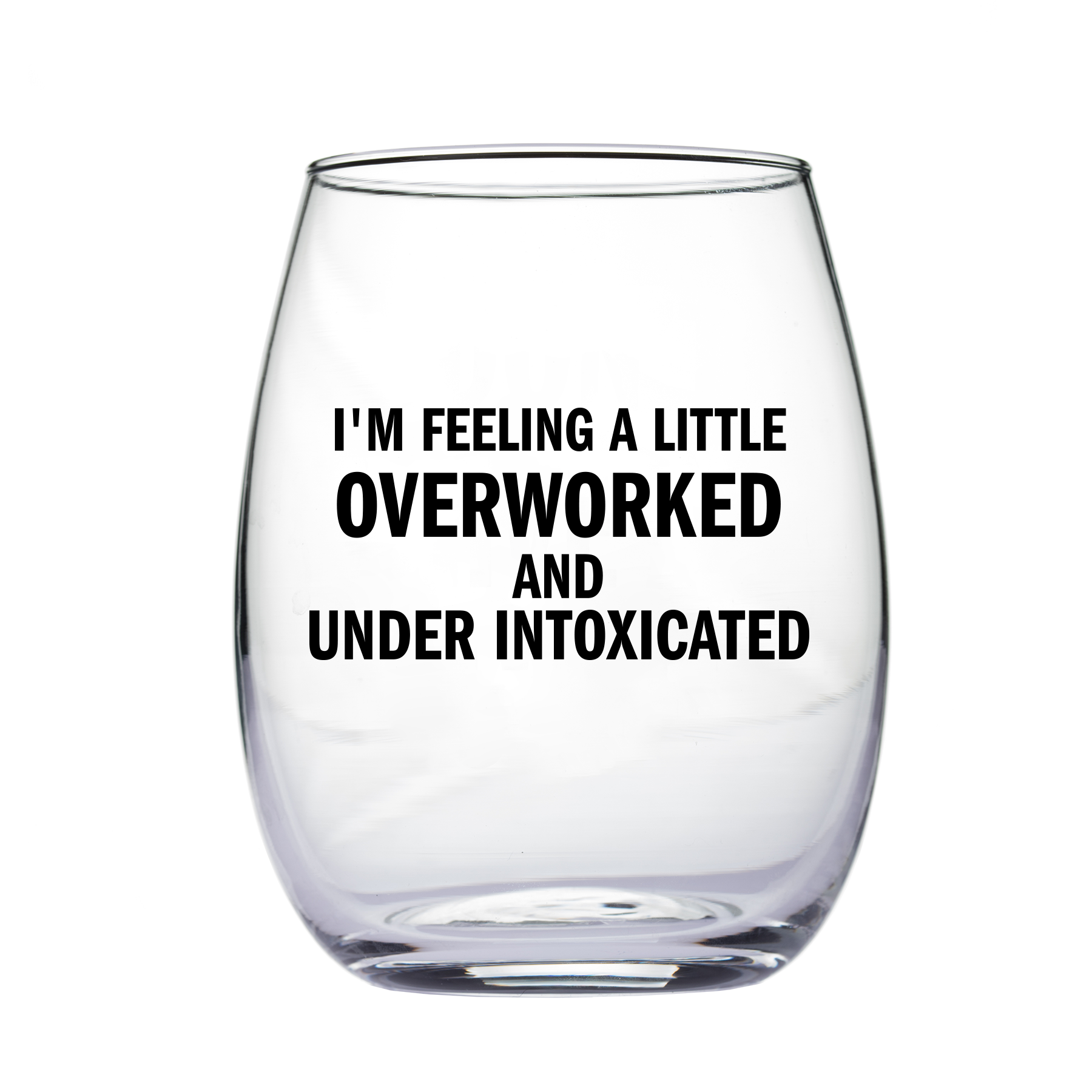"I'm feeling a little overworked and under intoxicated" Make wine nights fun with these snarky wine glasses! Hand wash only. Stemless wine glass is 15 oz and comes in a white gift box.