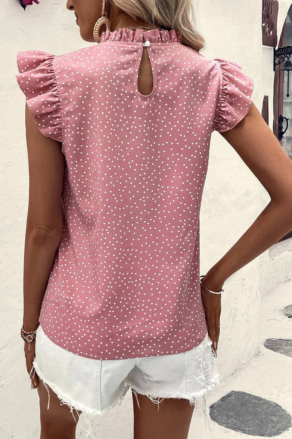 Polka Dots Ruffle Flutter Sleeve Frilled Neck Blouse