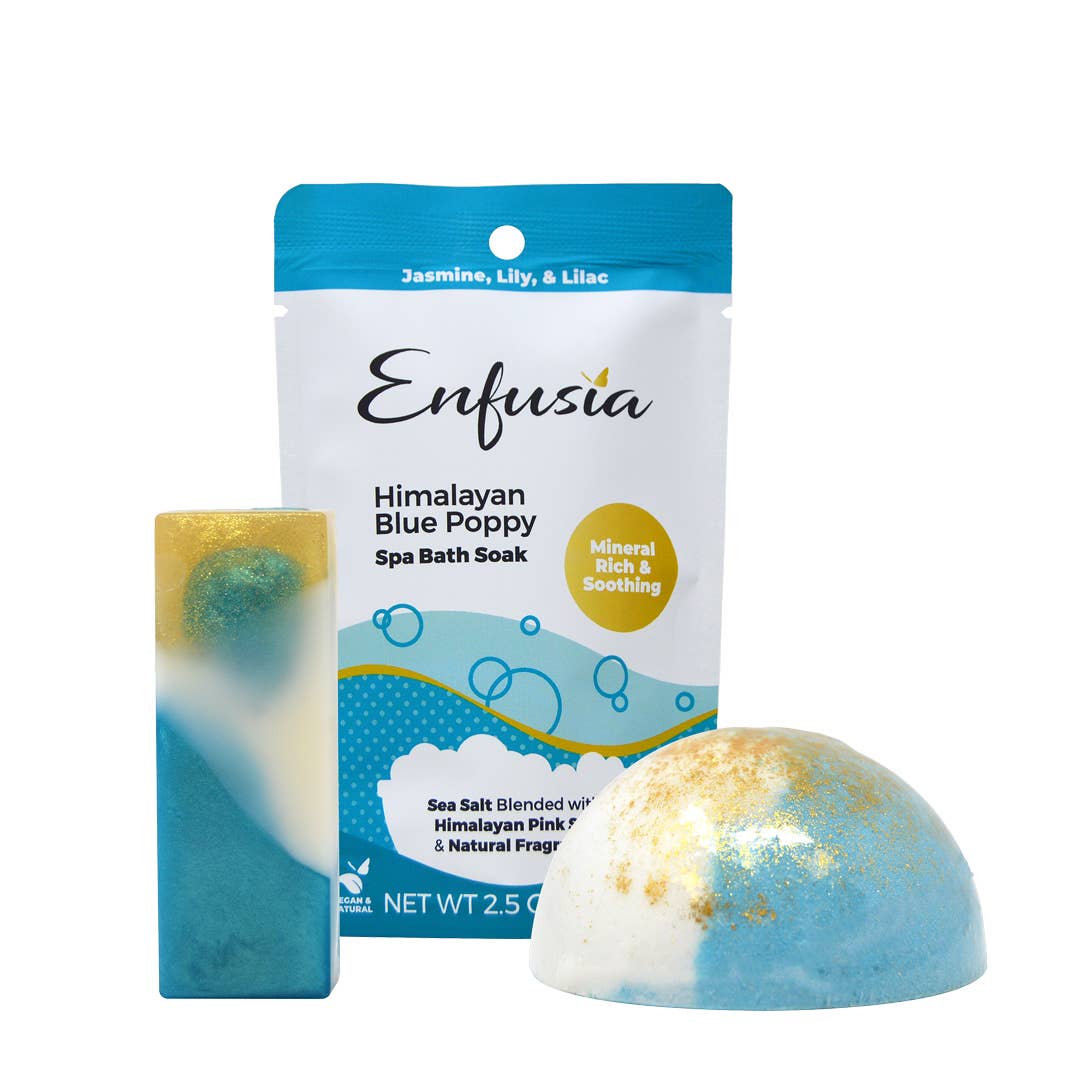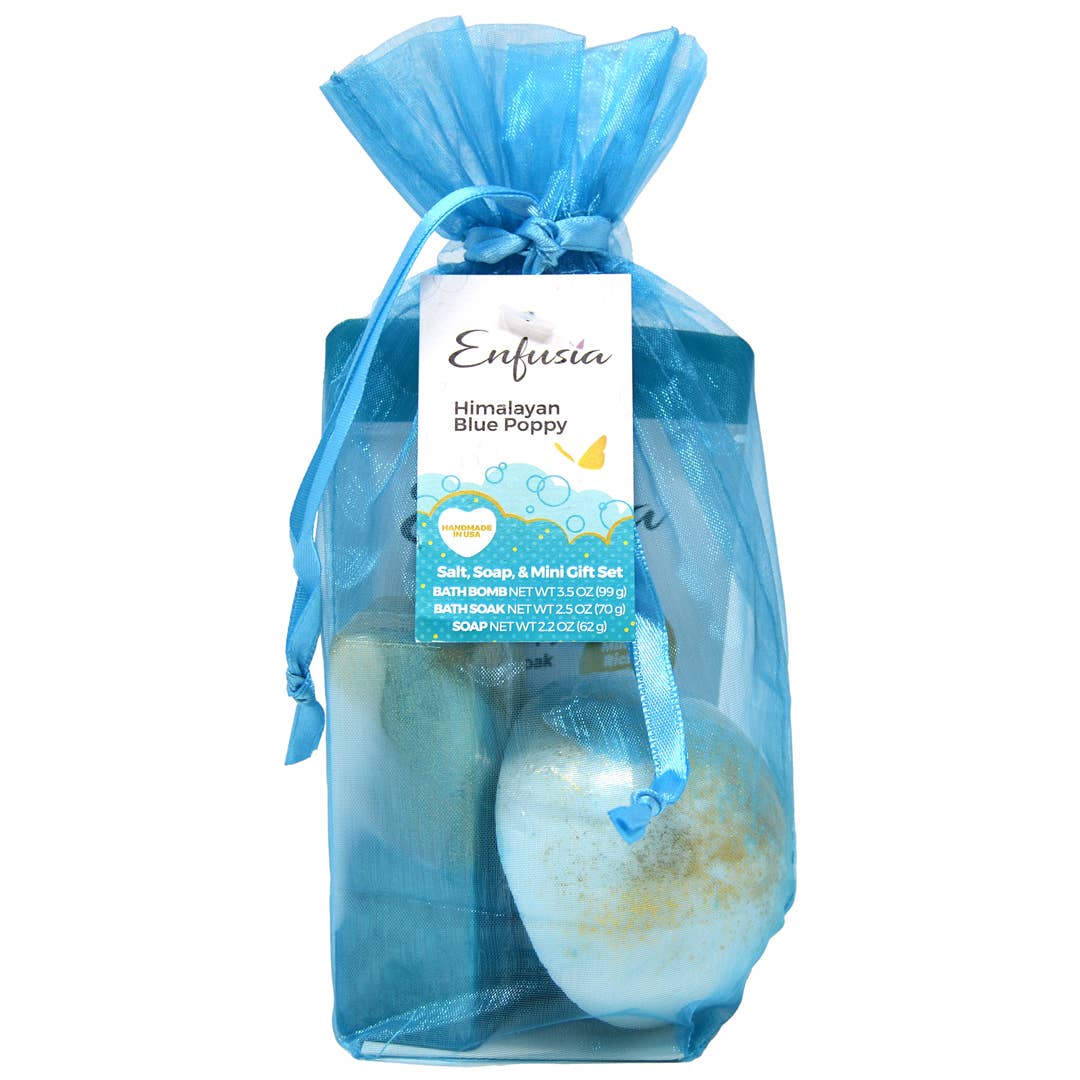 Himalayan Blue Poppy:- An exotic combination of jasmine, lily and lilac kissed with amber. The salt, soap, & mini gift set is the best way to experience a luxurious bath with three different ways to make every bath beautiful. Handmade mini bath bombs, hand blended spa bath soaks, and handmade premium soap will delight your senses and soften your skin. Salt, soap, & mini gift set contains: 1 (3.5oz) 1/2 bath bomb. 1 (2.2 oz) premium handmade soap bar. 1 (2.5 oz) spa bath soaks. Net wt. 8.7 oz (246 g).