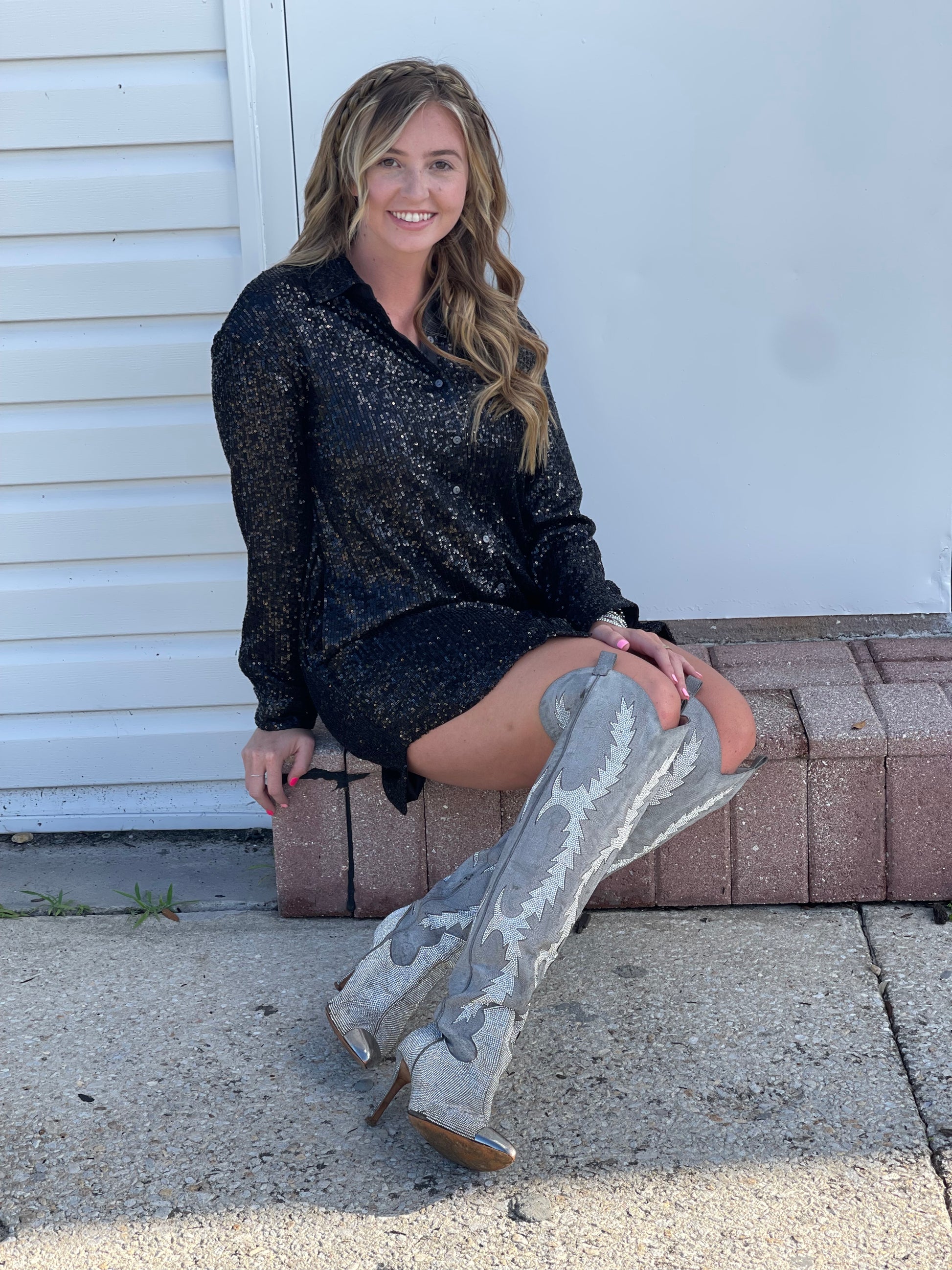 This dress is a rare find - a garment that works both as a fashionable shirt and as a glamorous dress. It's adorned with sparkling sequins, giving a fancy, fancy touch! Feel confident and stylish, whatever the occasion - dress it up for a night out or down for a casual day around town.