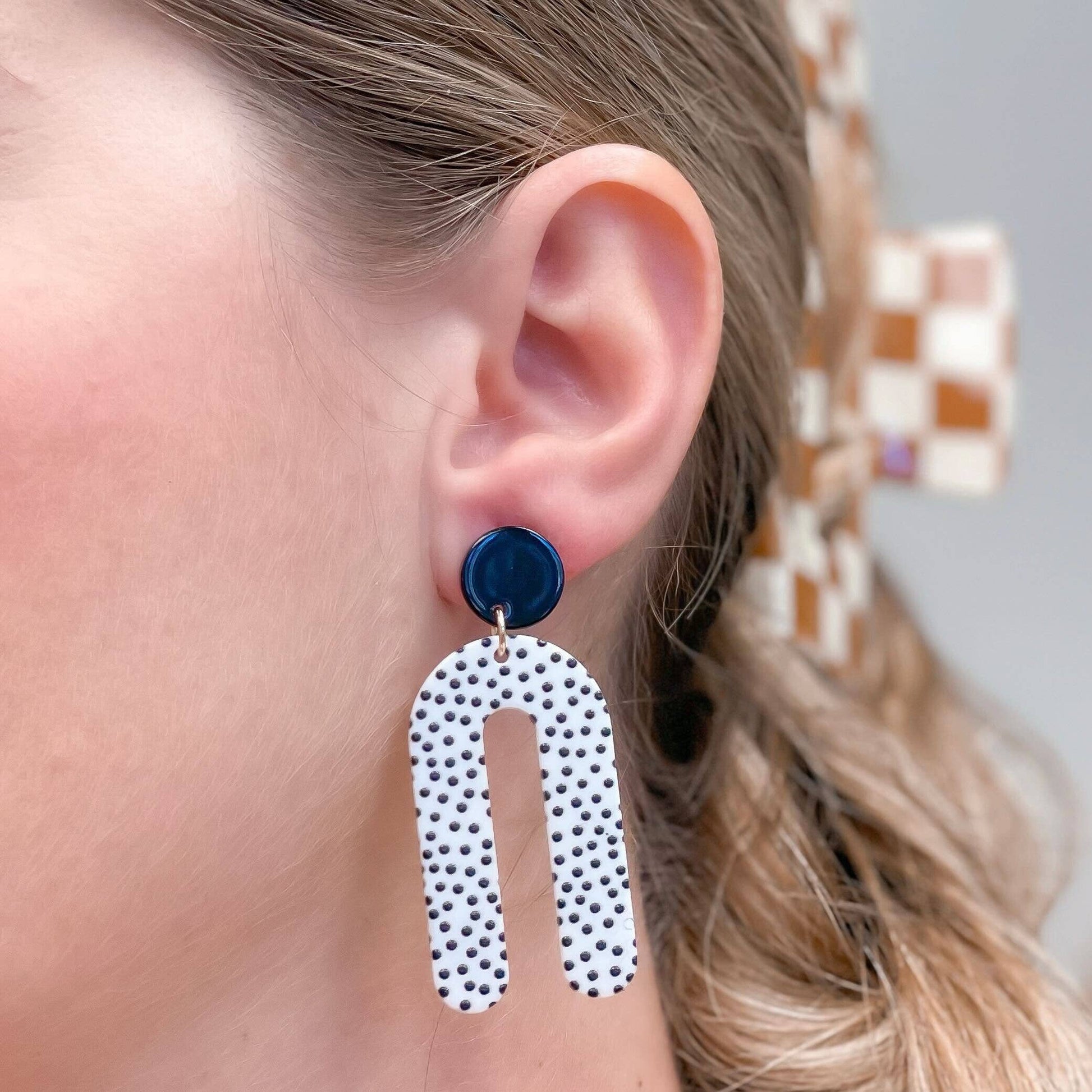 Add a pop of fun to your jewelry collection with our Spotty Dot Arch Dangle Earrings! These quirky earrings will make a statement and add a touch of playfulness to any outfit. Get ready for compliments and lots of smiles.