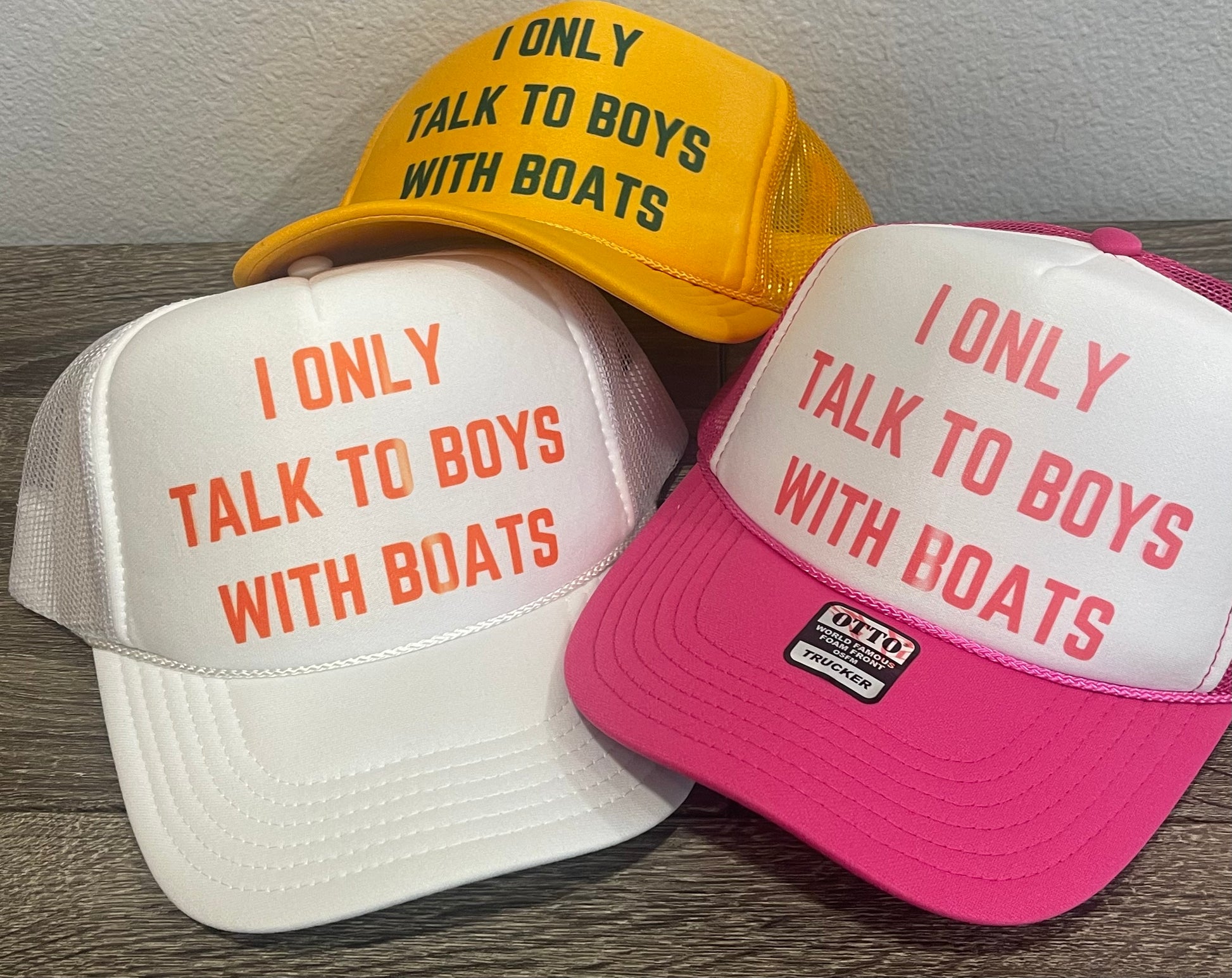 Make waves in style with this stylish Trucker Hat! Featuring the funny slogan "I Only Talk To Boys With Boats", this cutie is perfect for summer boat days or anytime you wanna make a splash. So, grab your anchor and sail away in the pun-tastic way to turn heads!