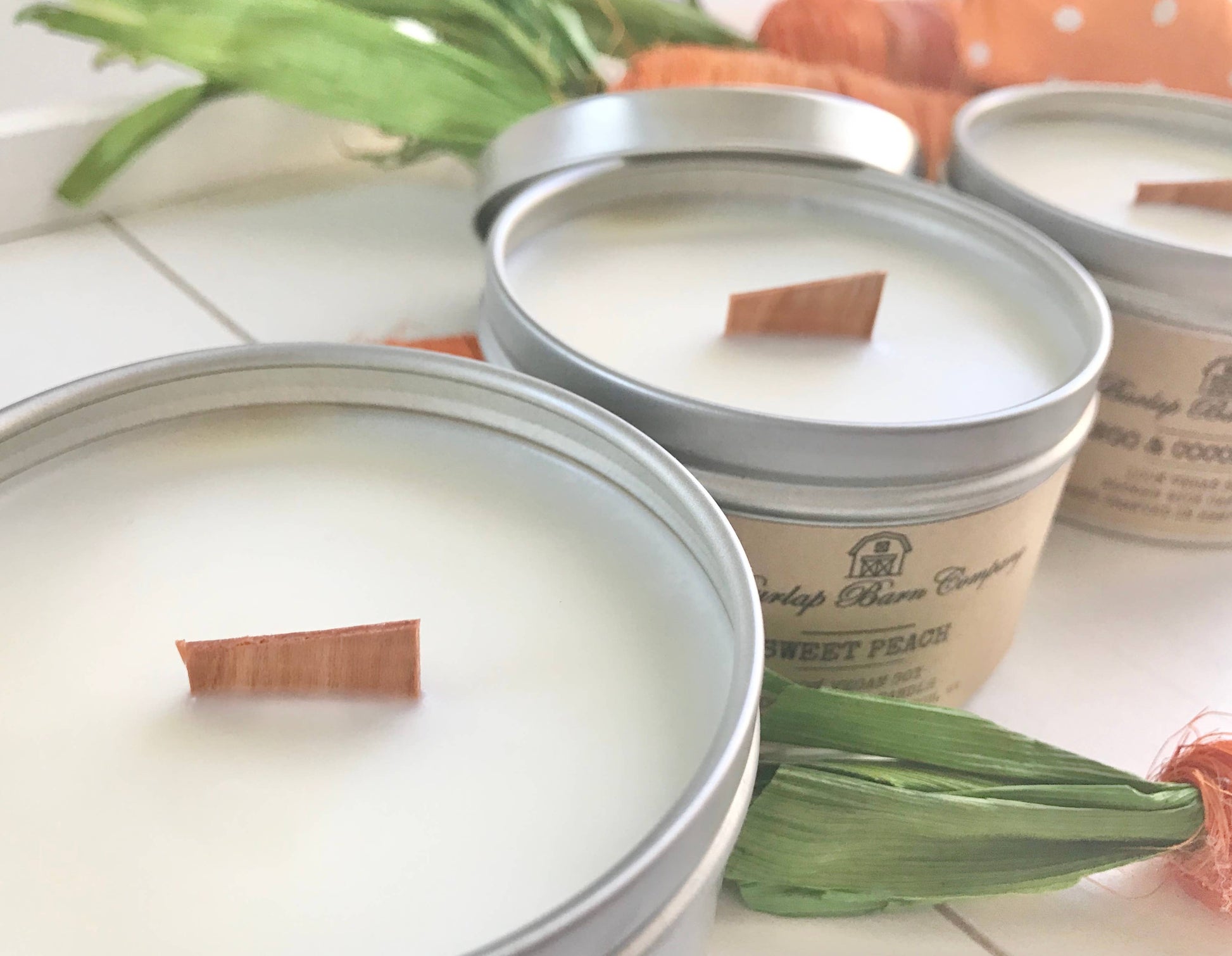 The Burlap Barn Company Wooden Wick Candle Tins are made with all natural 100% Soy Wax with zero additives. All of our wooden wicks are naturally processed and sourced from Forest Stewardship Council (FSC) certified mills and manufactured with pride (and great skill) in the USA using soft woods like Elm, Maple, and Birch. Which means our wooden wicks are sourced from a completely renewable forest right here at home. We hand pour each candle in small batches right here in historic Hampton, Virginia. These premium crackling wooden wicks add an unique ambience to these candles with a beautiful horizontal flame. Our candles burn for approximately 20-35 hours, created in an 8 oz. candle tin.